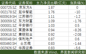全天净流出额超1亿元的个股有5只。京东方A(000725.SZ)、延华智能(002178.SZ)、江苏银行(600919.SH)遭主力资金大幅抛售,分别净流出1.87亿元、1.76亿元、1.11亿元。其中,延华智能跌停。此外,东方财富(300059.SZ)、平安银行(000001.SZ)、华西证券(002926.SZ)等金融股受到主力资金的冷遇,分别净流出1.09亿元、1.03亿元、0.83亿元。