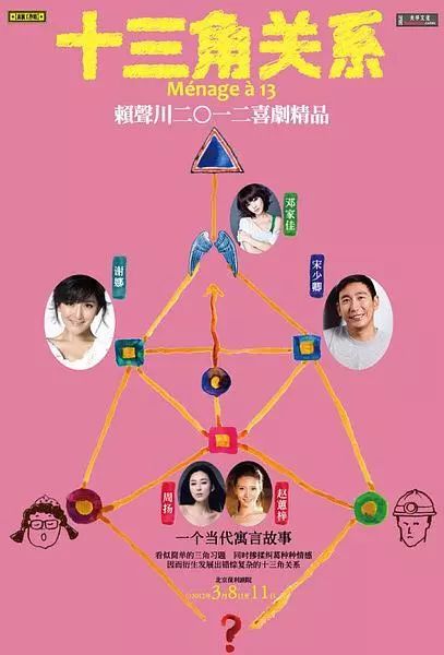 三角关系还不够,竟然有《十三角关系》……赖声川导演以当年轰动台湾的电台女主持人绯闻事件为创作原型,探讨了妻子与情妇,先生与夫人、先生与情妇、亲子之间、三代之间等种种情感。男主人公“蔡六木”的身份被设置为立法委员,让这部伦理大戏在探索人类情感之外,又有了一些政治讽喻意味。