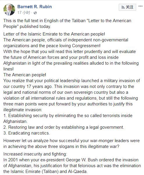 塔利班发言人穆贾希德(Zabihullah Mujahid)于2月14日在网上发布了公开信的各语言版,信中详细列出了美军在阿富汗17年来的伤亡、巨额花销和一系列“反面成果”。