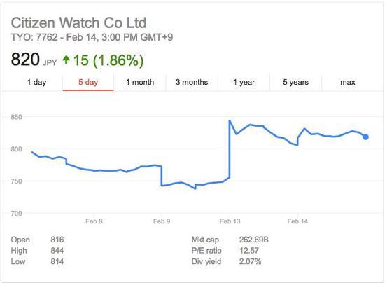 2月9日东京股市一开盘,西铁城便低开3.9%,但又在13号开盘暴涨,一举收复失地。