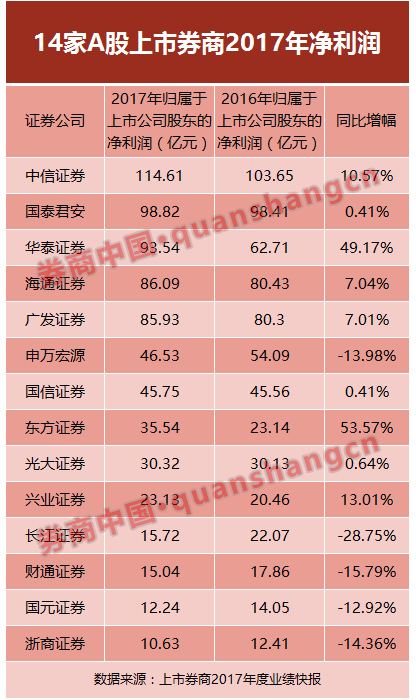 在2017年净利润超过10亿元的券商中,东方证券、兴业证券、平安证券、海通证券、广发证券等券商净利增幅靠前,同比增幅区间为7%至54%不等。而整个证券业去年实现净利润 1129.95 亿元,同比下降 8.47%。