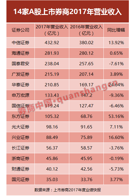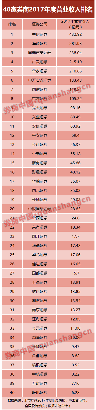 在上述已公布2017年度财务数据的40家券商中,有8家券商营业收入超过100亿元。