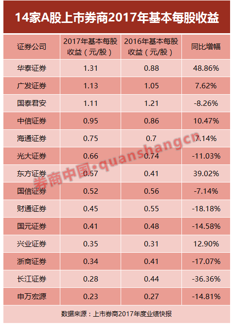 从基本每股收益指标来看,华泰证券2017年以基本每股收益1.31元高于其他13家A股上市券商,依然位居第一,同比增幅48.86%;广发证券2017年以基本每股收益1.13元位列第二,同比增长7.62%;东方证券2017年基本每股收益0.57元,同比增幅39.02%。