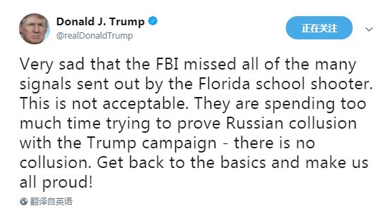 周日,特朗普再次就此事发文,把战火蔓延到FBI,指责FBI一心扑在“通俄门”调查中,“放过了佛州校园枪击案枪手发出的所有信号”。