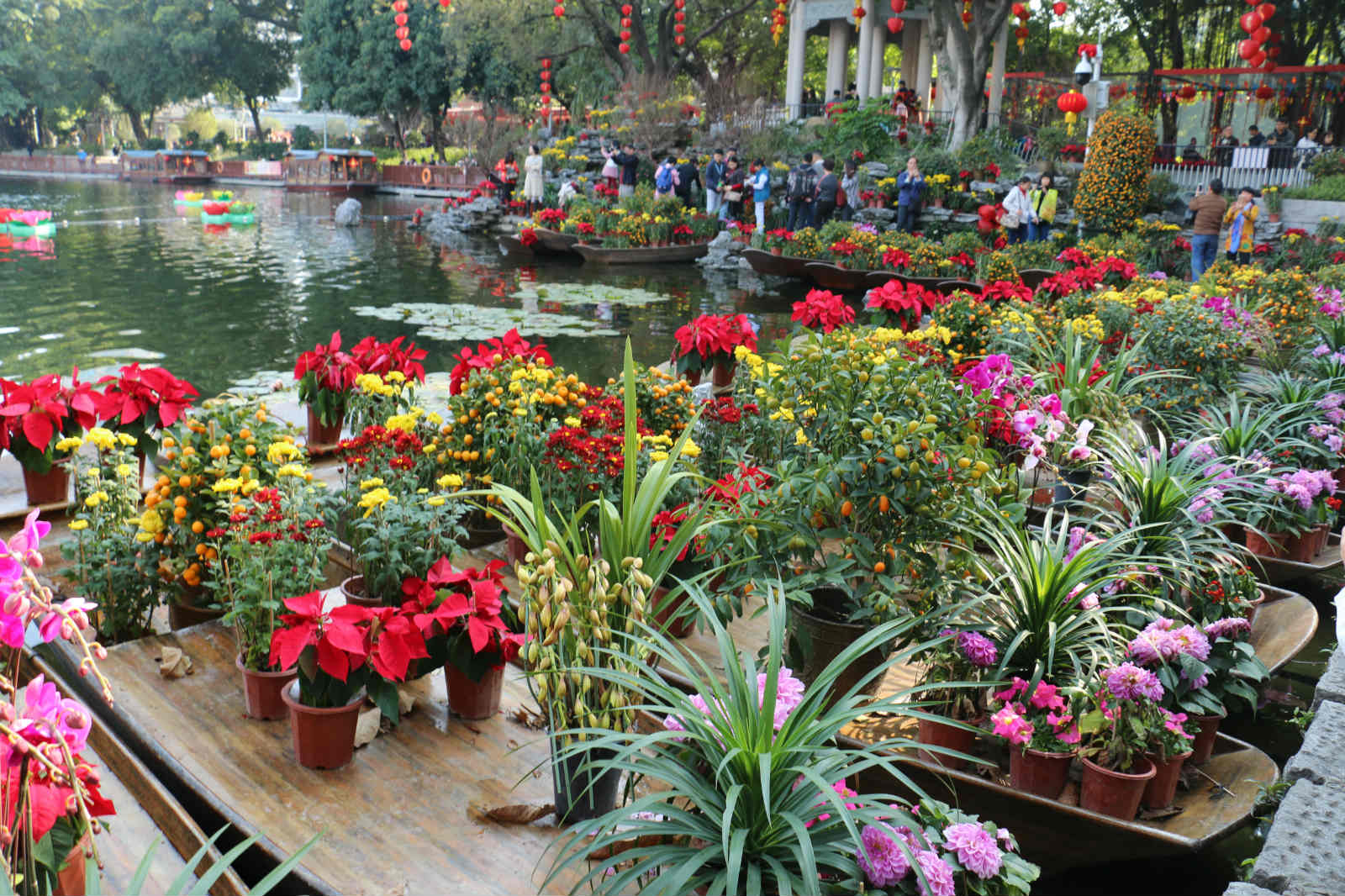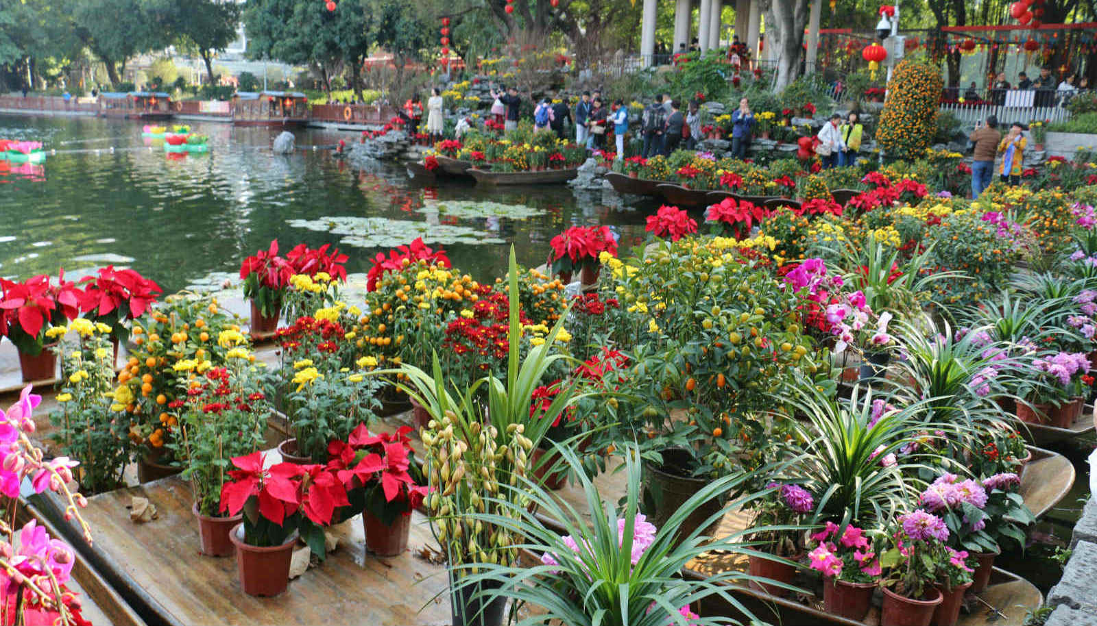 在北方严冬腊月草木萧疏之时,岭南却是另一番景象。大大小小的迎春花市在年廿八前后开放至初一凌晨,每个区都有自己的花市——在热闹的商业中心戒严一段马路,或延伸成几条长廊,又或在公园里设一个区域,一档连一档卖鲜花和年货。其中最有特色的是老西关荔枝湾涌的水上花市,花放在船上卖,涌两边是岭南的传统建筑,沿路都有广州的传统小吃,还有粤剧表演和民谣展览。