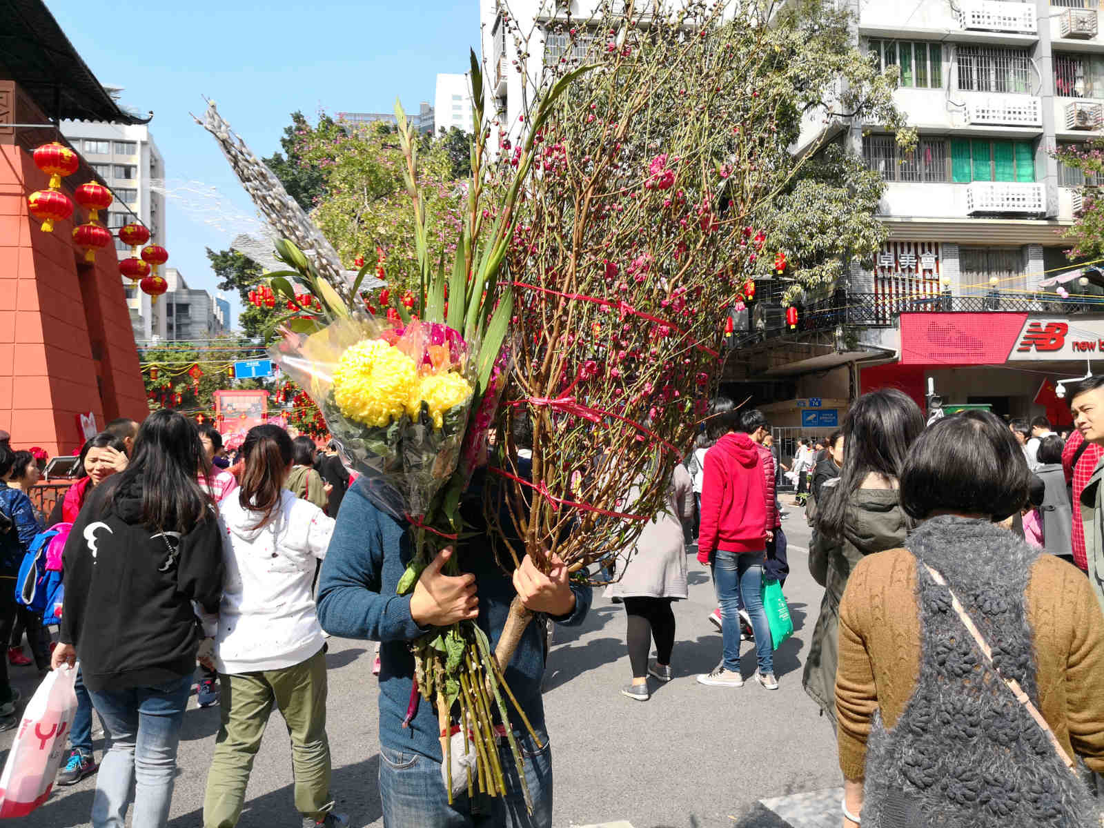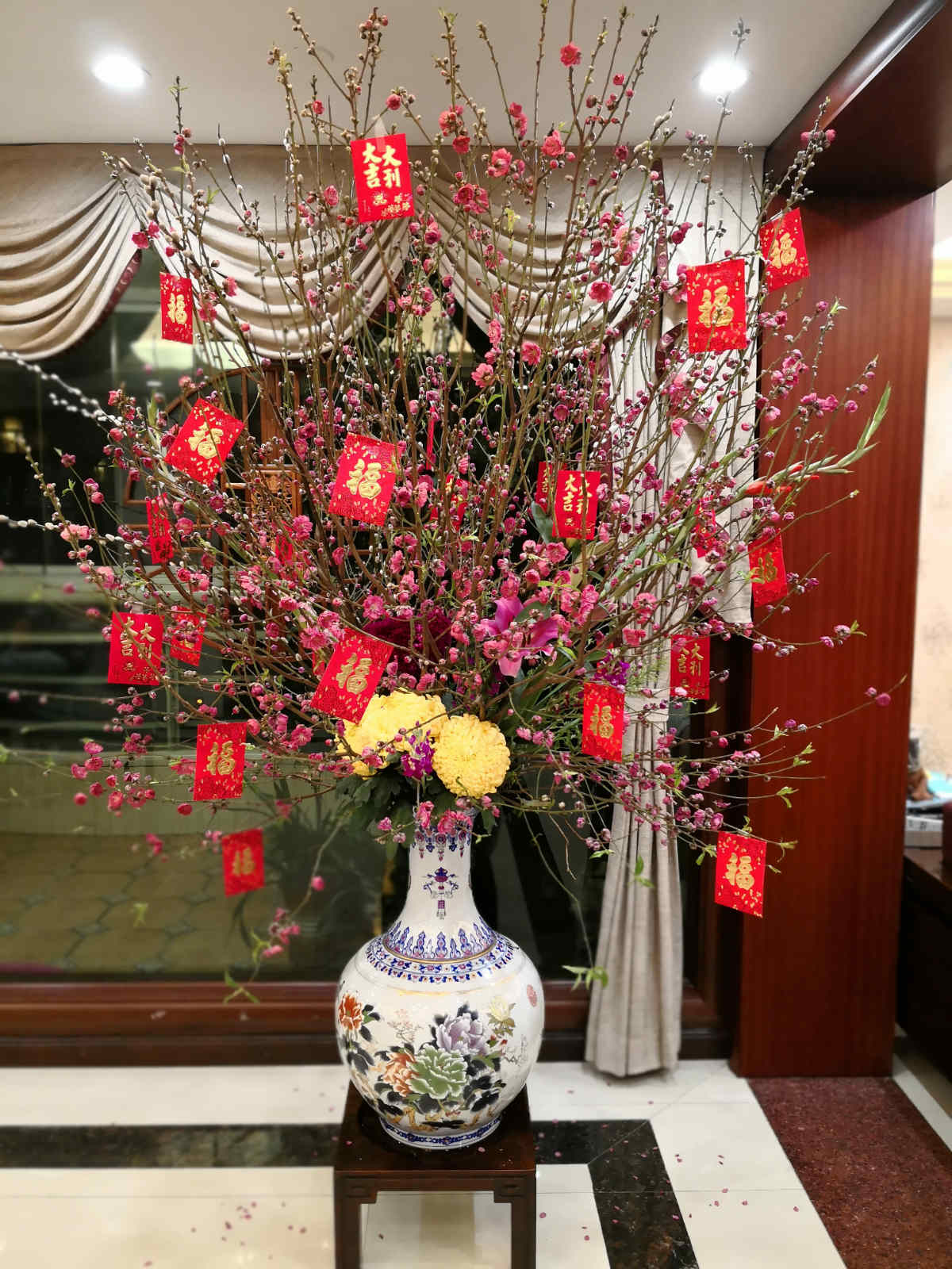 我探寻完毕时,小郭也买得差不多了。我以为他只是买一支桃花枝,没想到他买了一棵桃花树,不仅如此,还有菊花、银柳、剑兰、鸡冠花、百合等作为配花。小郭把这些花搬回家后,插到花瓶中,再挂上“利是”,就大功告成了,只等正月花苞绽放。