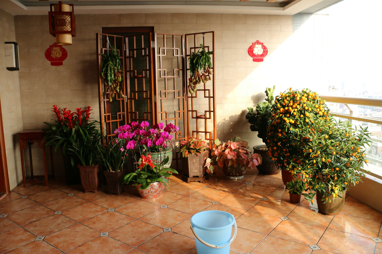 除了桃花,家里的阳台上还有家婆为了新年所添置的各种植物。她说二月初就开始准备春节的各种东西了,每年都会提前很多去买花。有些花她也不知道学名叫什么,只知道这个叫“吉祥”,那个是“如意”。还有挂在架子上的猪笼草,沿枝叶浇水后还要将水专门倒进“笼”里。在家婆眼里,这个形似植物大战僵尸里豌豆荚的植物是个聚财的好意头。因为水为财,猪笼草里聚水就是“有钱带唔嗮(有钱装不完)”。
