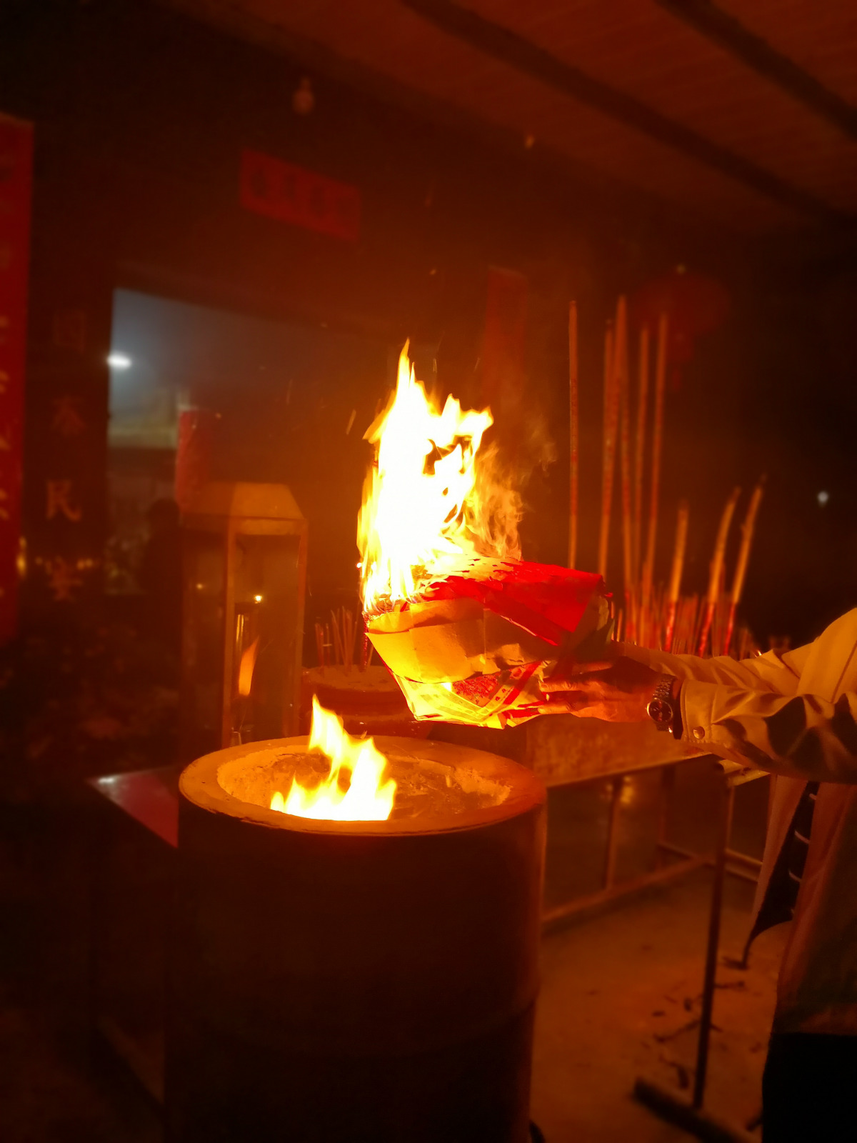 村口的庙并不大,若不是门口的香火,路人或许根本不会注意到这个房子。庙里供奉着一个叫医灵的菩萨和十来个大大小小的神像,一行人摆好贡品,每人点一把香,在庙里的每个菩萨面前虔诚地参拜许愿后,将香插到门口的香火台上。然后再点蜡烛,接着每个小家庭点一柱跟人一样高、四个手指粗的大香,最后化宝。纸做的金元宝印着符咒,带着一家人对新一年的美好心愿,消逝在烈火中。