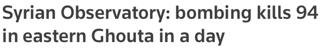 【叙利亚观察组织:袭击导致东古塔一天内94人丧生】一个战争观察组织周一称,叙利亚政府及其盟军的袭击增加,在24小时内在大马士革东部郊区的叛乱分子据点东古塔打死94人。