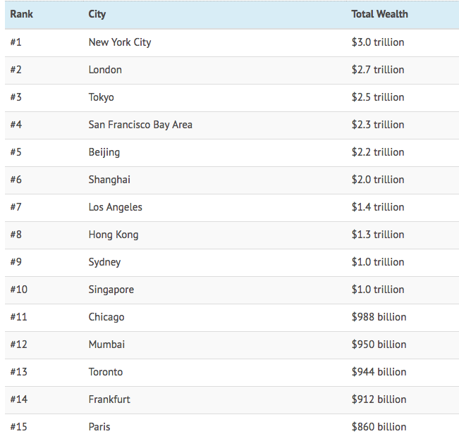 在统计了居住在各个地区人群所拥有的房地产、现金、股票和企业股份家之后,纽约市成为当之无愧的王者,以价值3万亿美元的财富名列榜首。