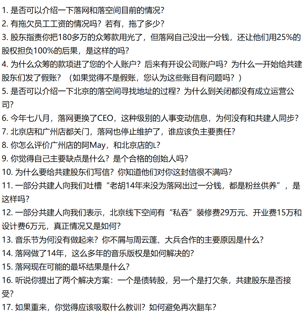 落网曾计划为线下店做背景乐服务,也有和85°C合作的案例,但不知为何,合作没有继续;落网还曾开售电子音乐期刊,胡建国对外表示,客单价98元的线上音乐期刊已经卖出了70万份。但这个数据也被质疑掺水,“如果这个数据属实,那落网账上将有近7000万元,还要融资干啥?落空间还会因为几百万的亏损就倒闭?”共建人H直接找到落网员工询问落网用户日活,得到的回答是:网页+App日活不到3万,远低于胡建国口中的8万,他极为气恼地向虎嗅吐槽:“我现在老胡极其不信任,他极其不靠谱。”