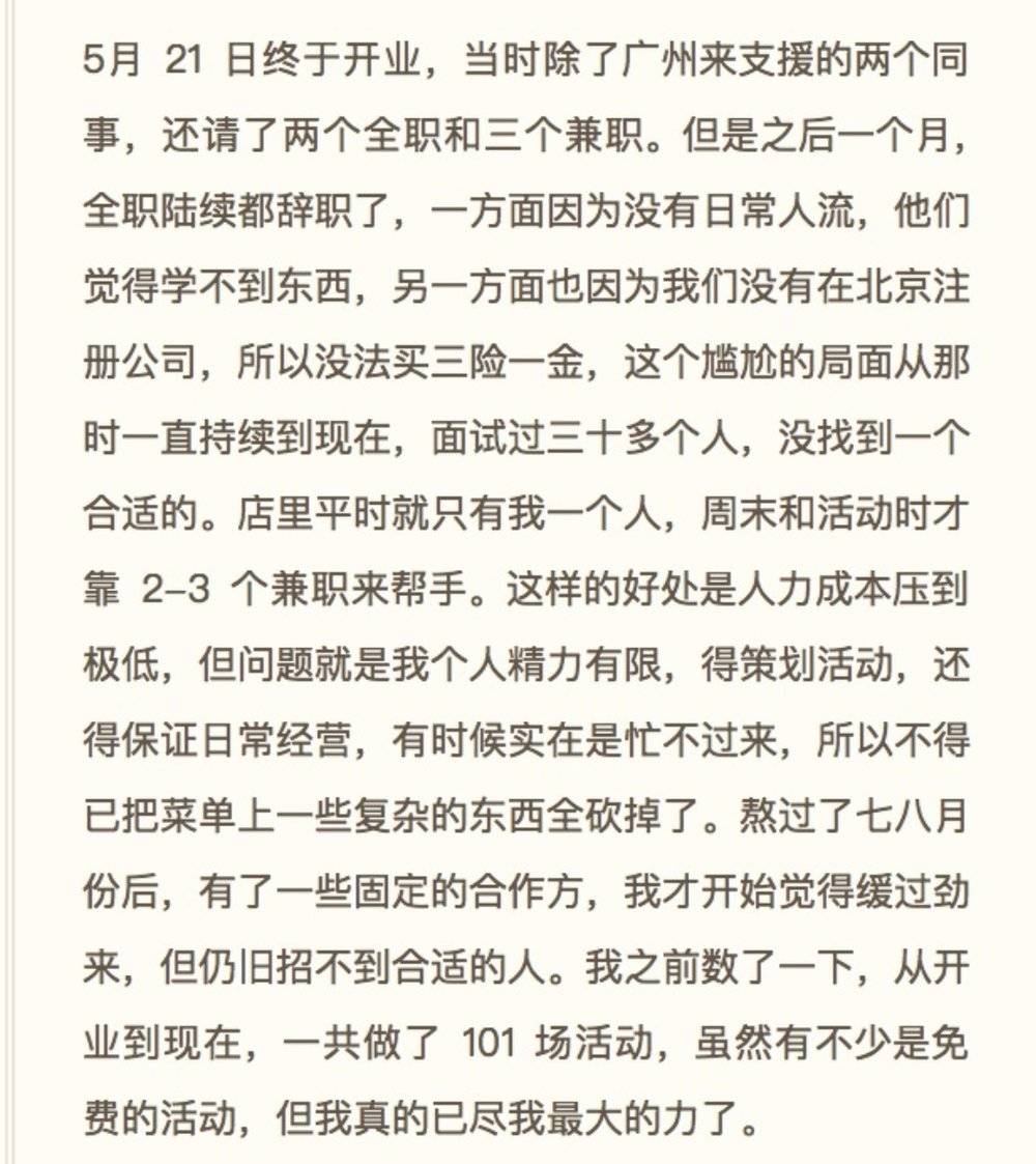 在发出了那个引发众怒的关店通知后,胡建国还于2017年12月7日发了《给共建人的一封信》,他在信中表示,关店的原因是遭遇到了选址、管理经验不足、线下市场多样性变化和经营不善。