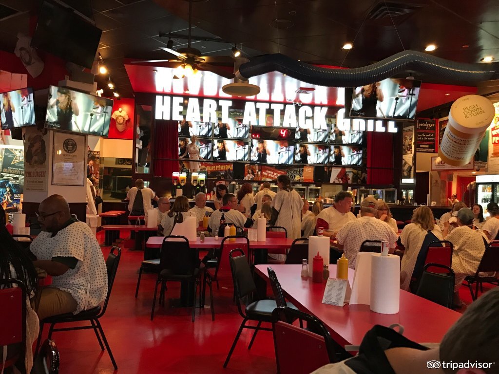 在美国拉斯维加斯有一家颇受欢迎的汉堡餐厅叫做心脏病发餐厅,在餐厅里,服务生们都穿着护士服,而客人也需要换上病人的服装。这里的汉堡取名为心脏手术中的“搭桥”,“四边搭桥”汉堡一个就有上万卡路里,这些摄入量相当于正常人一周所需!