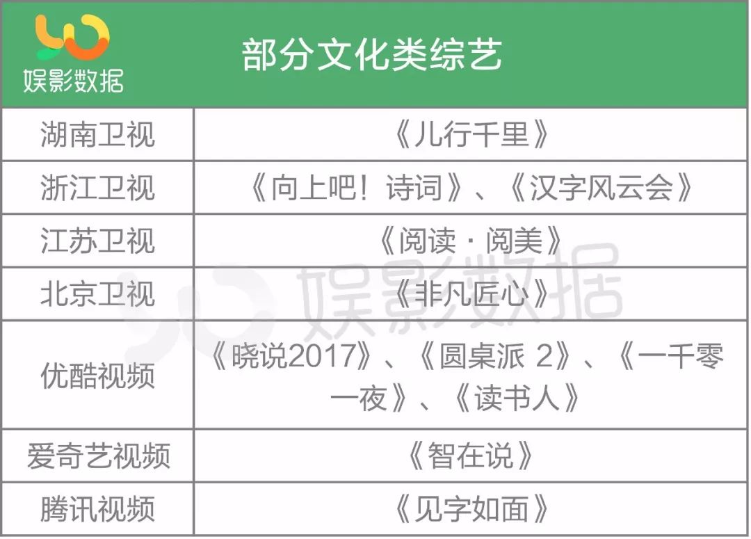 这样的现象级数据给了众多卫视极大的信心。湖南卫视推出《儿行千里》、浙江卫视带来《向上吧!诗词》和《汉字风云会》、江苏卫视主打阅读类节目《阅读·阅美》、北京卫视推出文化体验节目《非凡匠心》;视频平台也不甘示弱,优酷推出了《晓说2017》、《圆桌派2》、《一千零一夜》、《读书人》等综艺,爱奇艺打造了脱口秀《智在说》,而腾讯则拿下了《见字如面》。