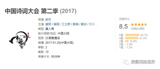 据央视数据显示,《中国诗词大会2》10期累计收看观众达到11.63亿人次;微博#中国诗词大会#的阅读量达到1.5亿,讨论超40万;收官战播出收视率破1,排在实时的第一位;豆瓣上该节目评分为8.5,44.4%的人打了5星。