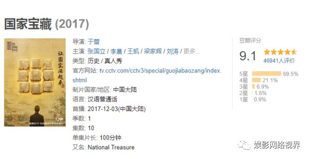 2017年12月3日播出的《国家宝藏》是由中央电视台、央视纪录国际传媒有限公司承制的文博探索节目,由张国立担任001号讲解员,李晨、王凯、梁家辉、王刚、段奕宏、刘涛等明星担任国宝守护人。节目将纪录片和综艺两种创作手法融合应用,以文化的内核、综艺的外壳、纪录的气质,创造了一种全新的表达。这一节目的质量毋庸置疑:豆瓣9.1分,69.5%的人打了五星。