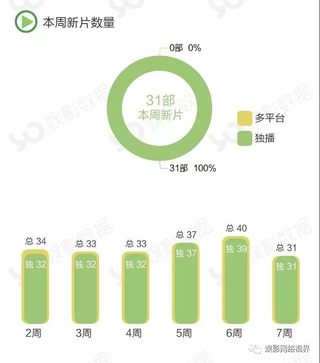 本周上新影片数量为31部,较上周减少9部,且皆为独播片。本周上新影片数量减少,也是网络电影播放量下降的原因之一。