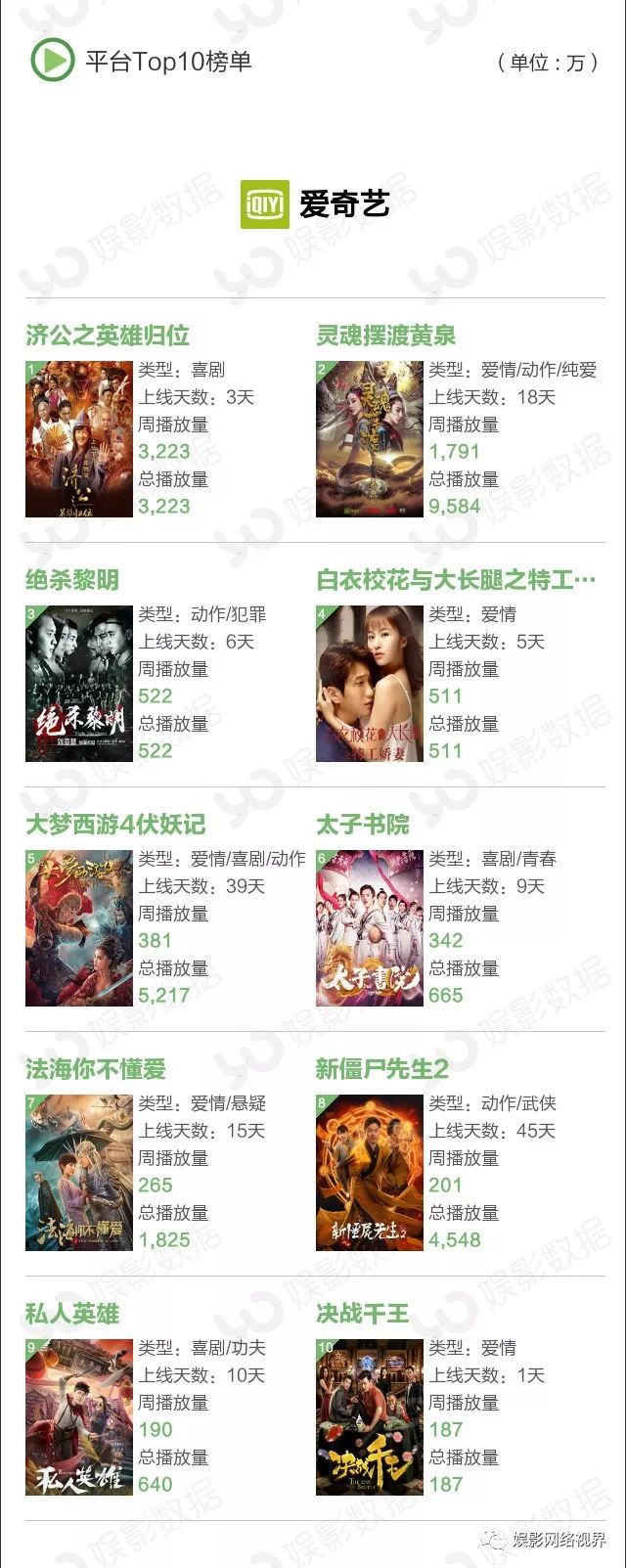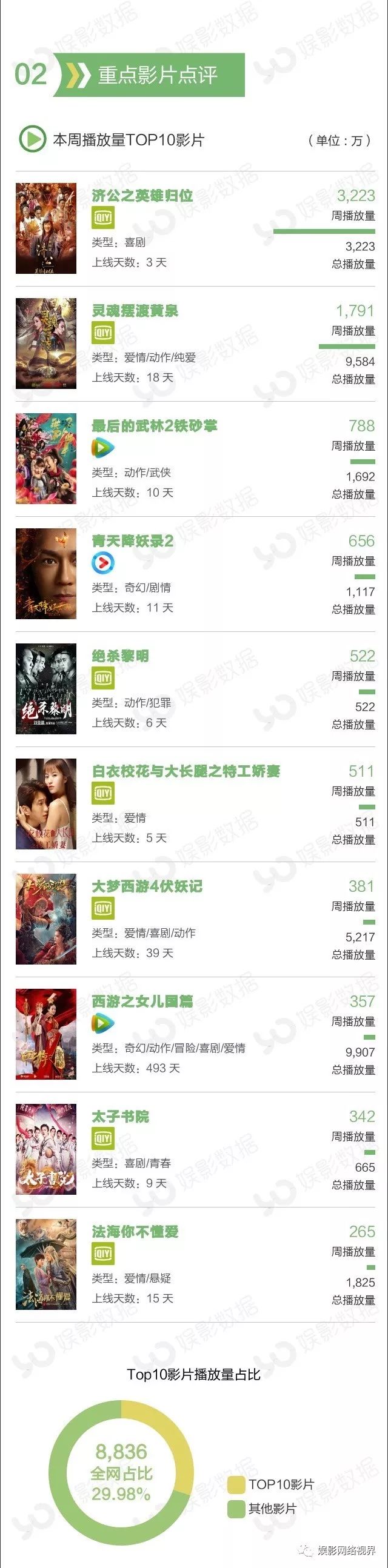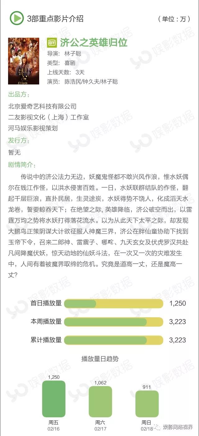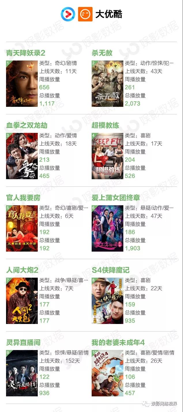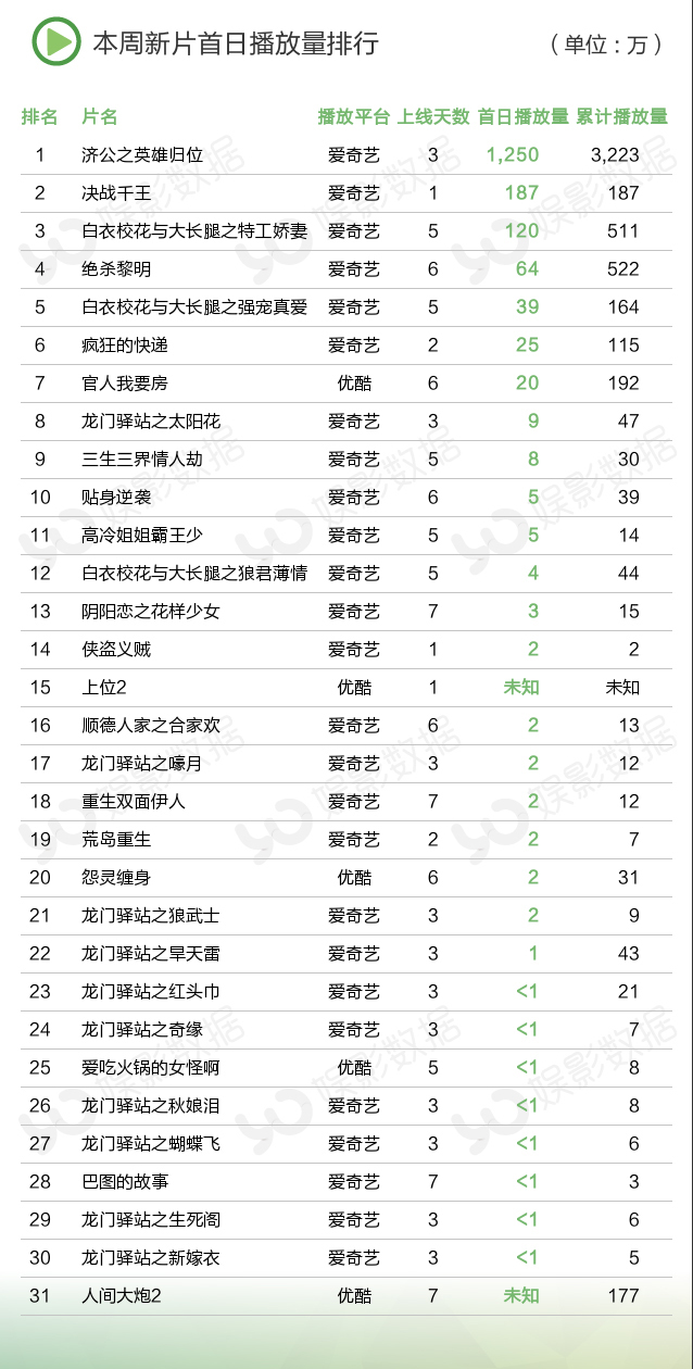 本周播放量前10榜单中有三部新片,都来自爱奇艺平台,上线3天的《济公之英雄归位》播放量达3223万,获得冠军;犯罪动作片《绝杀黎明》本周上线6天,周播放量522万次;玛丽苏网大《白衣校花与大长腿之特工娇妻》以511万周播放量排名第六。