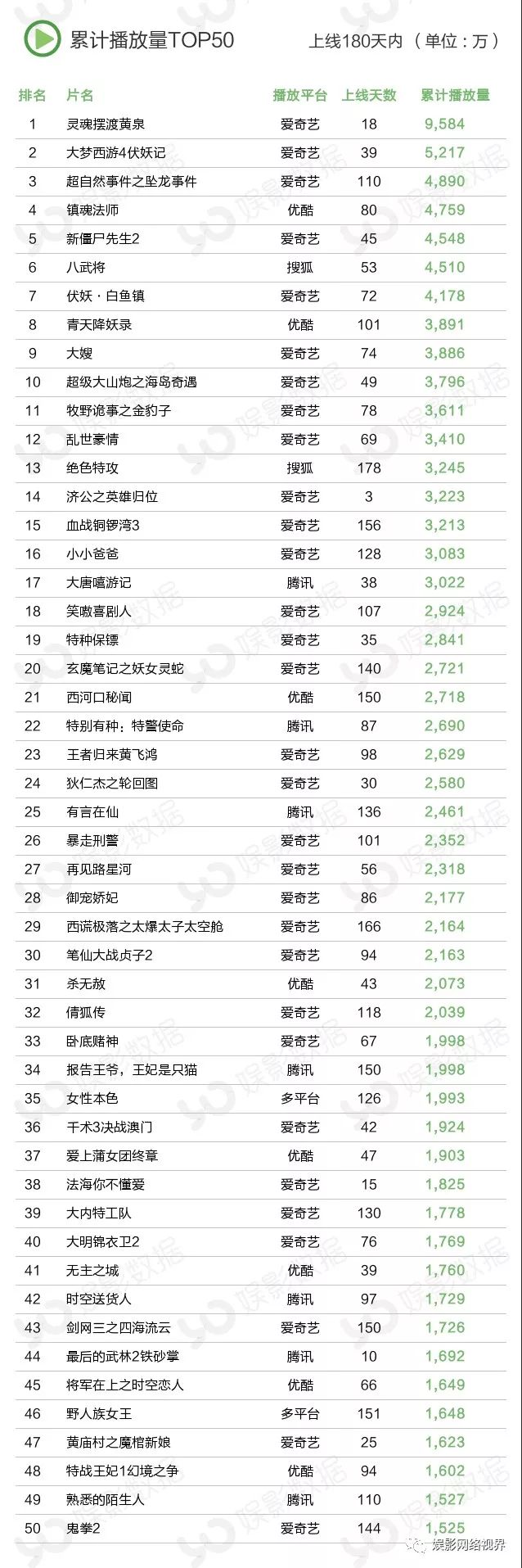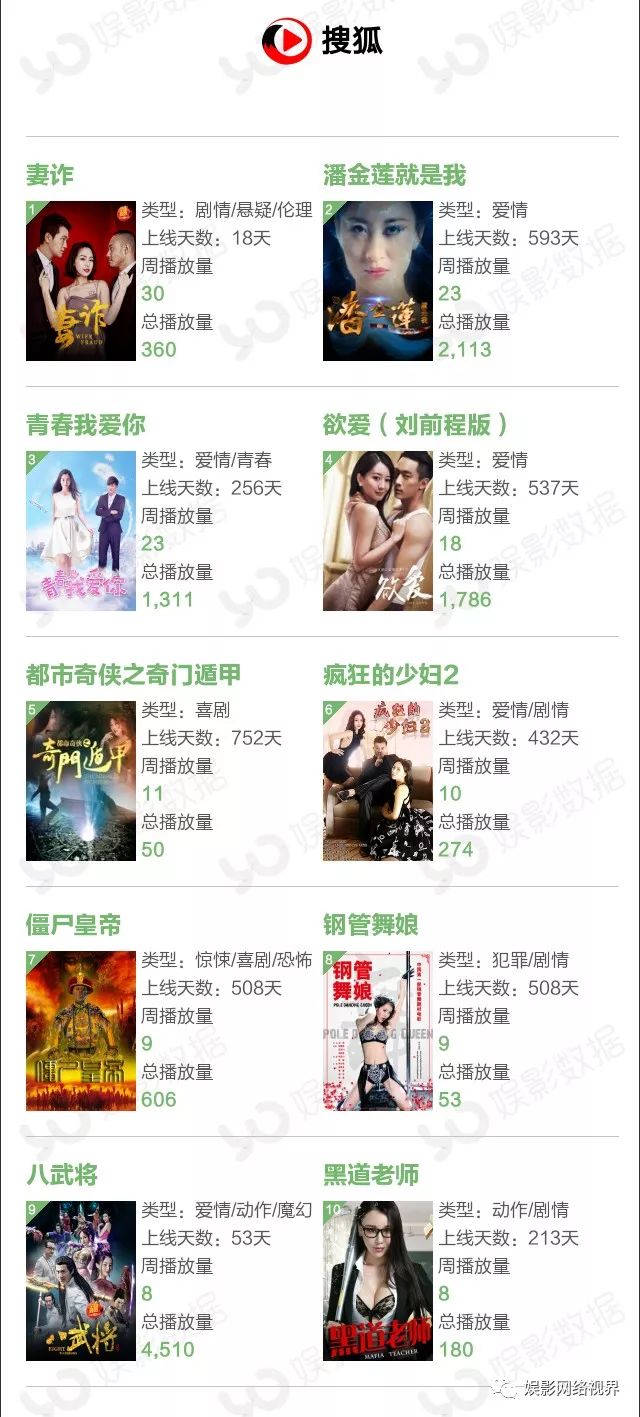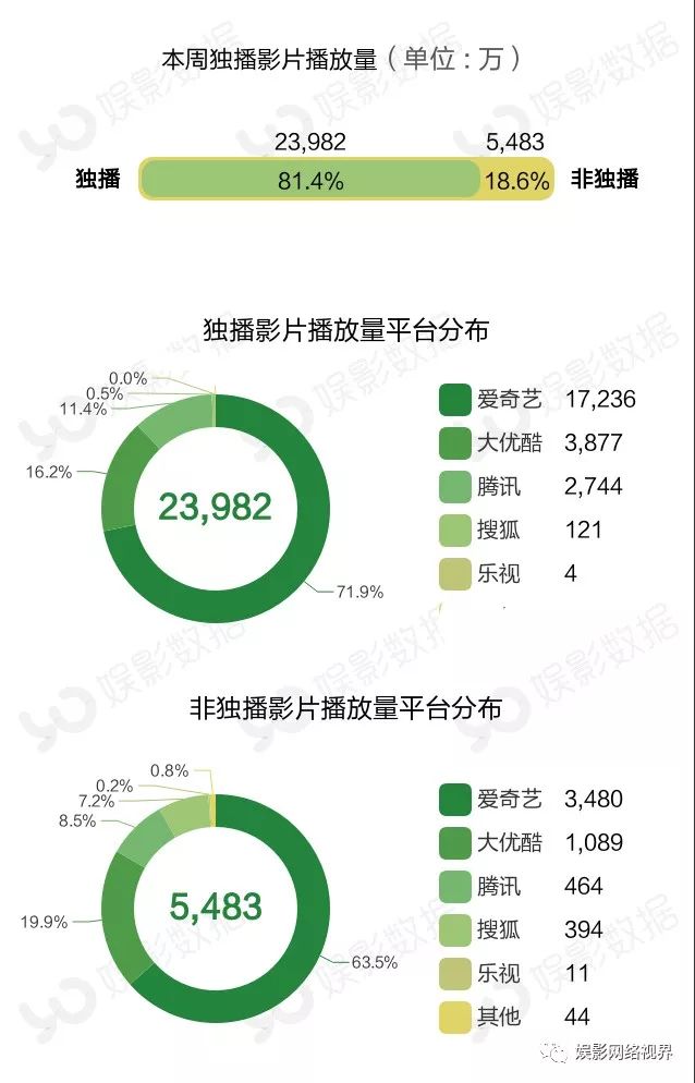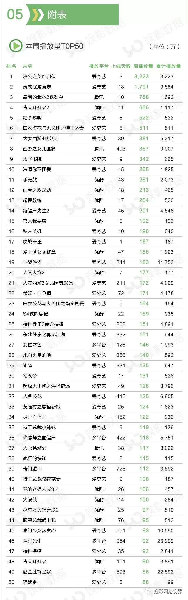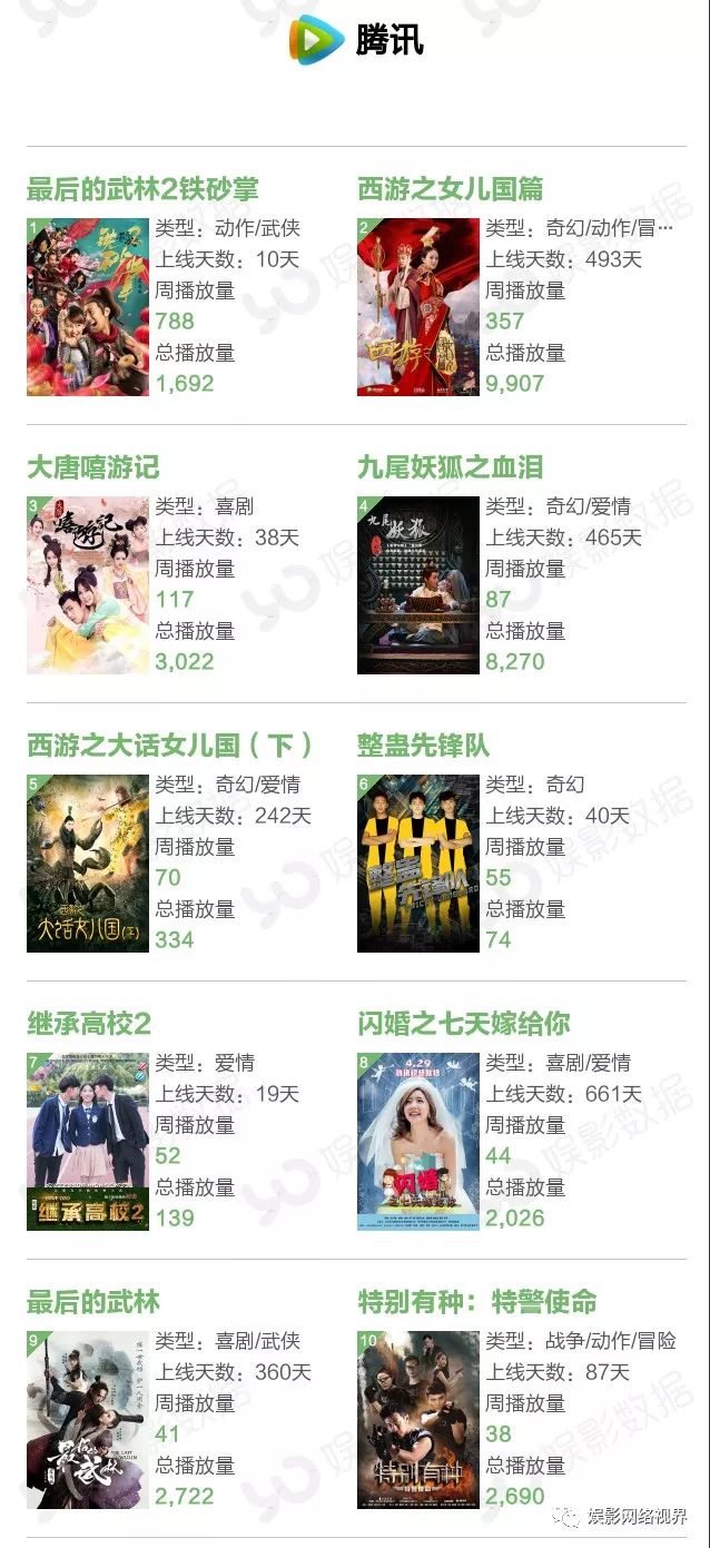 本周播放量前10榜单中有三部新片,都来自爱奇艺平台,上线3天的《济公之英雄归位》播放量达3223万,获得冠军;犯罪动作片《绝杀黎明》本周上线6天,周播放量522万次;玛丽苏网大《白衣校花与大长腿之特工娇妻》以511万周播放量排名第六。