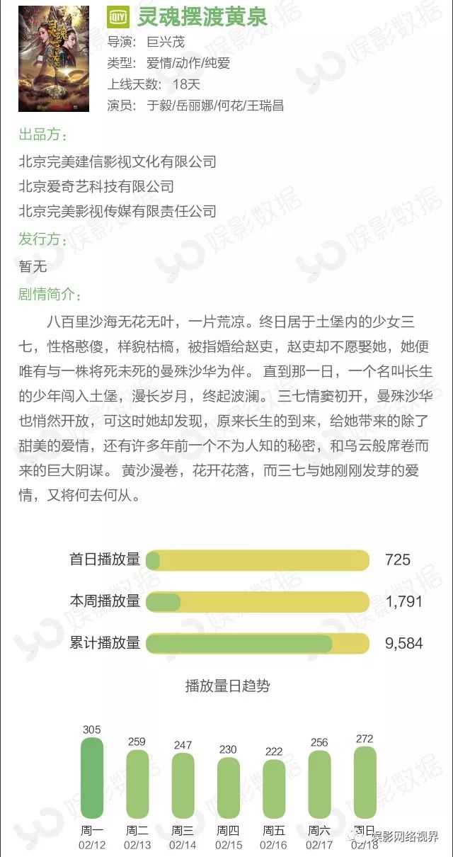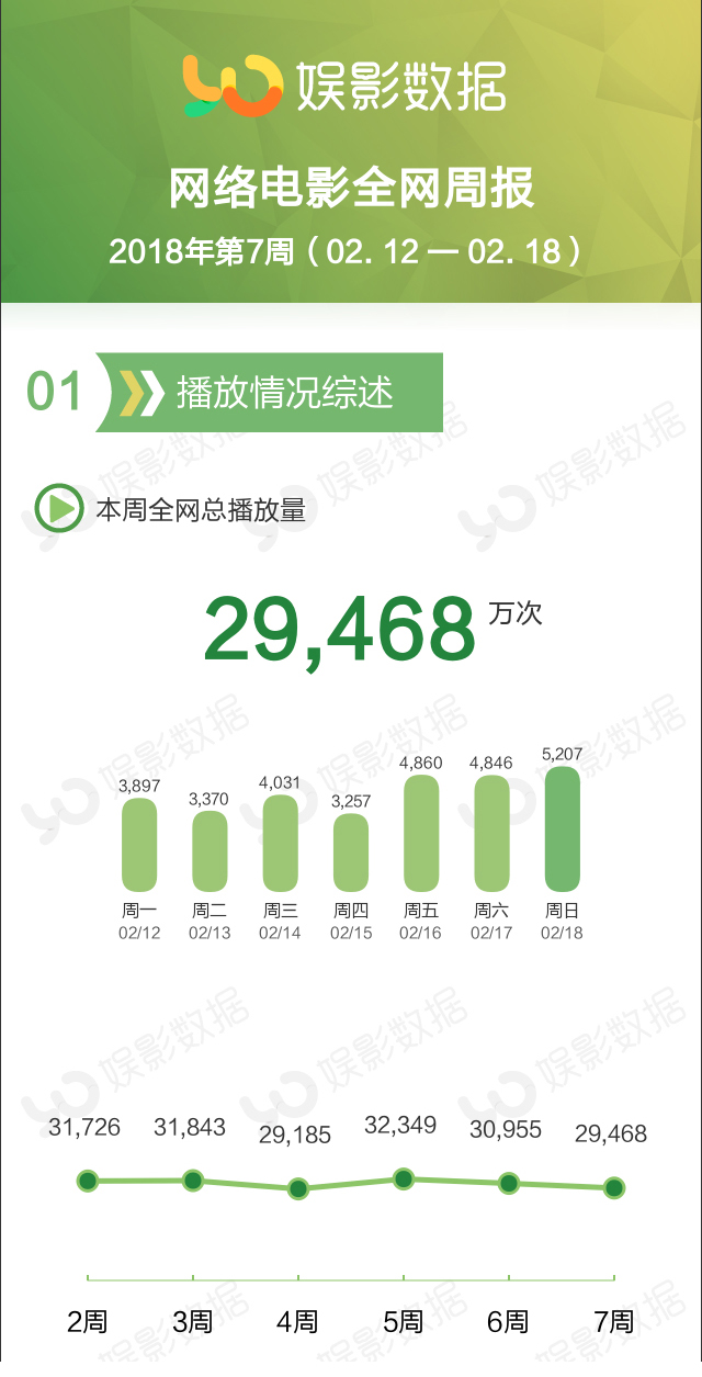 娱影数据显示,2018年第七周(2月12日至2月18日)网络电影的全网播放量2.95亿次,较上周下降4.8%。尽管本周播放量持续下降,但总体来说,今年的网络电影播放量发展的还是非常平稳的,都是在合理的范围内小幅度增降,并总体呈现出上升趋势。