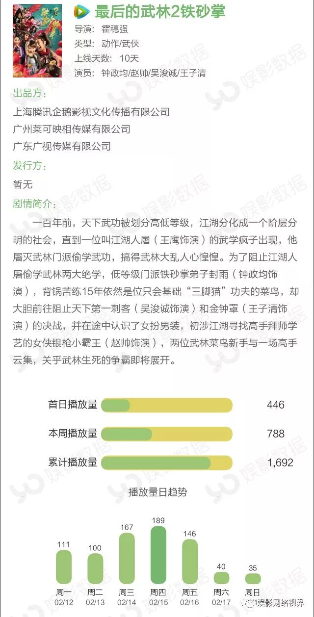 《最后的武林2铁砂掌》本周以788万次播放量继续蝉联季军。该片主打动作武侠,写实的武侠风格和大量的动作戏非常抢眼。