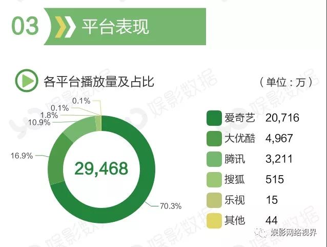 本周平台表现与上周基本一致,前三仍然是爱奇艺、大优酷、腾讯。其中,爱奇艺仍排名第一,占比70.3%,比重上升3.3%;大优酷排名第二,占比16.9%,下降1.6%;腾讯排名第三,占比10.9%,下降1%。
