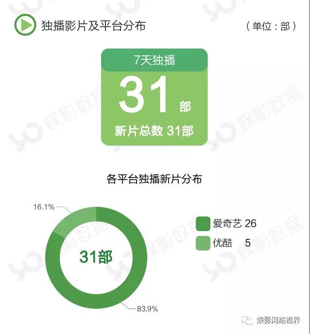本周共上线31部新片,比上周减少9部,本周新片皆为独播片。爱奇艺上新26部、优酷5部,腾讯、搜狐等平台本周皆无新片上线。