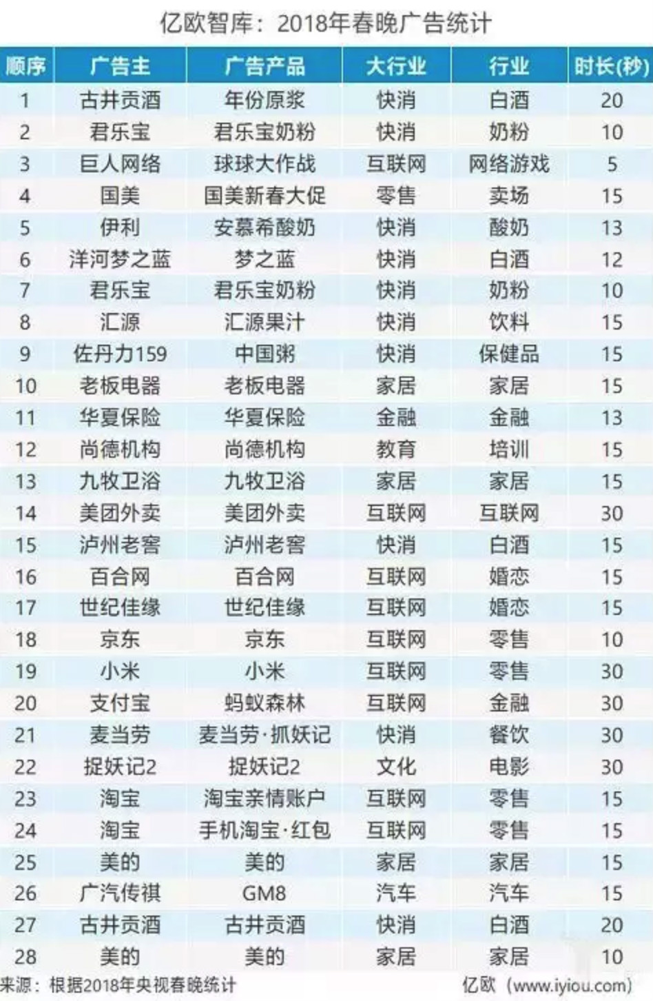 今年春晚的金主们达28位之多,其中快消品类占了10位,比如伊利、君乐宝、汇源等;互联网占9位,如美团、世纪佳缘、京东等;其它的汽车、家居、金融等所占不多。