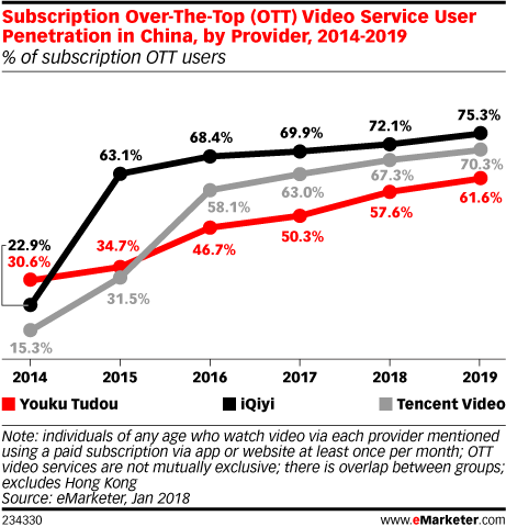 根据eMarketer的最新预测,2018年中国将有近2.29亿人通过付费订阅流媒体服务收看视频。