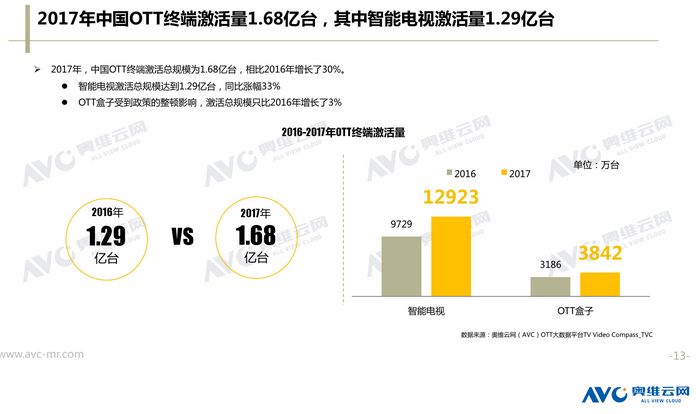 奥维云网的数据显示,2017年智能电视的终端激活量达到1.29亿,而在2016年,数字才只有9729万,甚至不到1亿台,增幅达到32.8%。而OTT盒子只有3842万台,增幅只有20.5%。