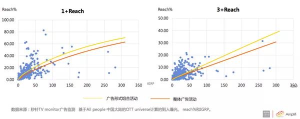目前组合投放成为品牌主青睐的形式。根据秒针监测的OTT广告活动,结合相应的广告活动线上调研结果,研究发现采用广告组合形式有效千人成本低于仅一种广告形式的成本,数据显示,贴片的有效CPM是181,贴片+暂停是126,而贴片+暂停+角标的CPM是107。2017年OTT广告资源组合的到达率表现优于整体水平。