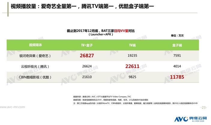从日均VV来看看,爱奇艺的TV+盒子的日均VV量最多,达2.68亿,属于实力最强的平台。细观之下,在TV端,腾讯视频的云视听极光播放量最高,而在盒子端,得益于天猫盒子的保有量,同是阿里系的优酷CIBN酷喵影视播放量最高,达到1.17亿的量级。