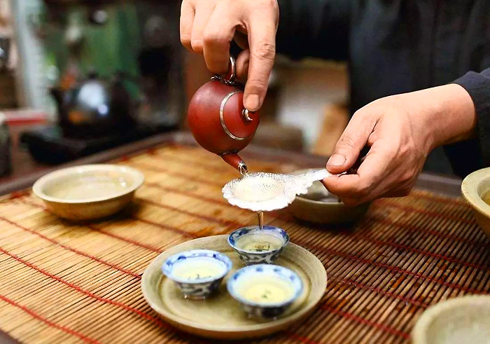 吃完蛋挞,别忘记去街市楼上有数十年历史的老字号茶庄刘裕发茶庄,体验传统的汕头工夫茶。“工夫”一词,在潮州话中是作事方法讲究的意思,而烹制、品尝工夫茶,自然也有一套独特的讲究。茶庄的刘老板亲自演绎整套功夫茶的流程,装茶烫杯、高冲低斟等繁多额步骤一气呵成,而在斟茶时,总是将三个茶杯并排放在茶壶前,轮流不停地来回斟茶,“这个步骤又叫‘筛茶’,需要连续不断地把茶均匀地筛洒在各个杯中,绝不能一次注满一杯,以免出现前浓后淡的情况。”他说,三个杯中茶的量、色泽要均匀相同,方为上等功夫。