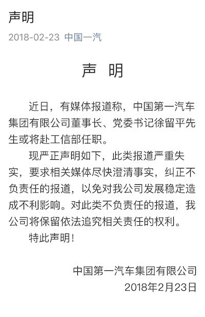 昨日晚间,中国一汽发布声明称“相关媒体报道严重失实”,要求相关媒体“尽快澄清事实”,并保留“依法追究的权利”。