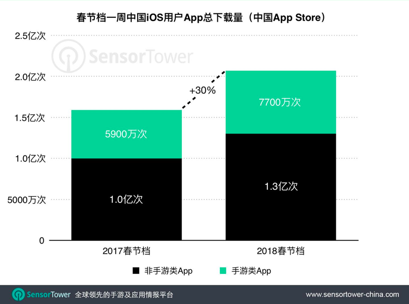 今年春节档一周,中国iOS用户共下载应用2.1亿次,同比去年上升30%。其中,非手游App下载量占比约63%,近1.3亿次。