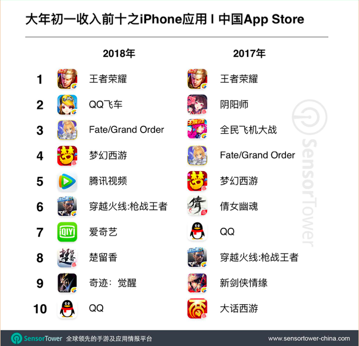 从以上排名对比中我们能看到,在过去两年的春节当天收入最高的十部iPhone应用中,手游占绝大多数。今年吸金TOP10榜单上,腾讯旗下App就占60%,包括两部非手游类App腾讯视频和QQ,以及四款手游作品:《王者荣耀》、《QQ飞车》、《穿越火线》、和《奇迹:觉醒》。