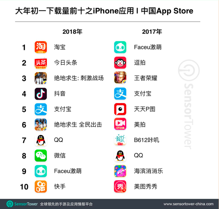 另一个有趣的趋势要属去年春节红热的一系列美图App,如天天P图、美拍、B612咔叽、和美图秀秀,今年统统销声匿迹。取而代之的是腾讯酝酿已久,终于在春节档高调上线的两款《绝地求生》正版手游,《绝地求生: 刺激战场》和《绝地求生 全民出击》,以及两部全民热衷的短视频App抖音和快手。而腾讯去年上榜的唯一一部手游《王者荣耀》今年正月初一也退出了前十强。