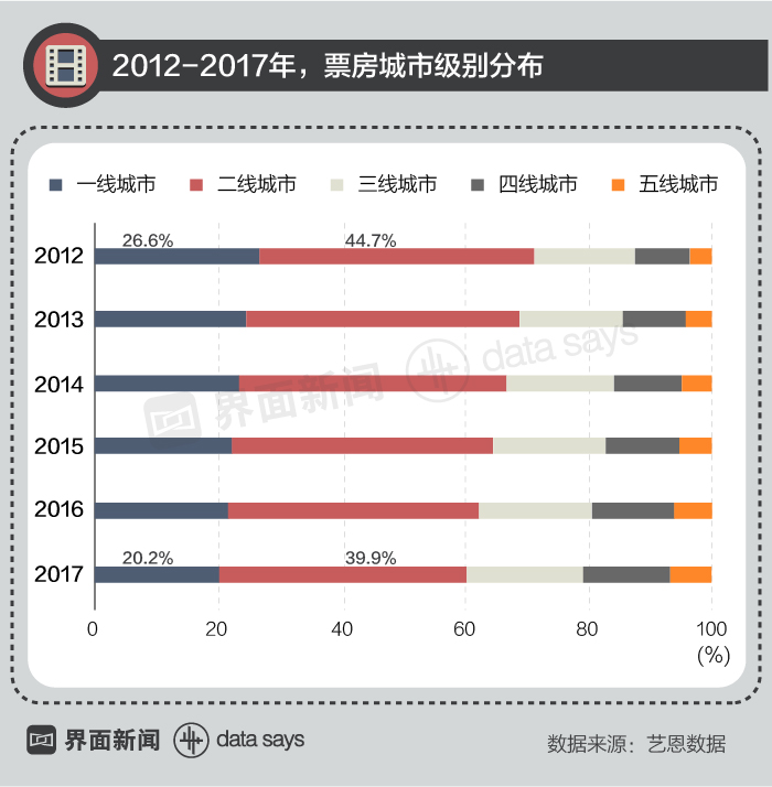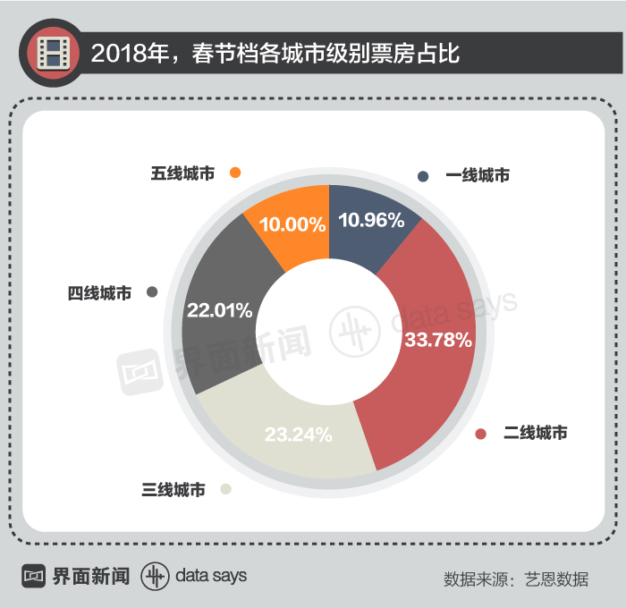 一、二线城市对中国电影票房的贡献率逐年减弱,三、四、五线城市居民的观影习惯正在养成。这一点在2018年春节档表现格外突出,其中一、二线城市的电影票房占比竟然已不足5成,而三、四、五线城市的票房占比达55.3%。