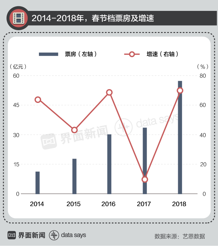 从大年初一开始,2018年春节档票房再创佳绩的消息就屡屡刷屏。艺恩网数据显示,2018年春节档的票房达57.15亿元,同比增幅高达69.63%,相比2017年春节档票房的微弱增势,史上最强春节档可谓当之无愧。