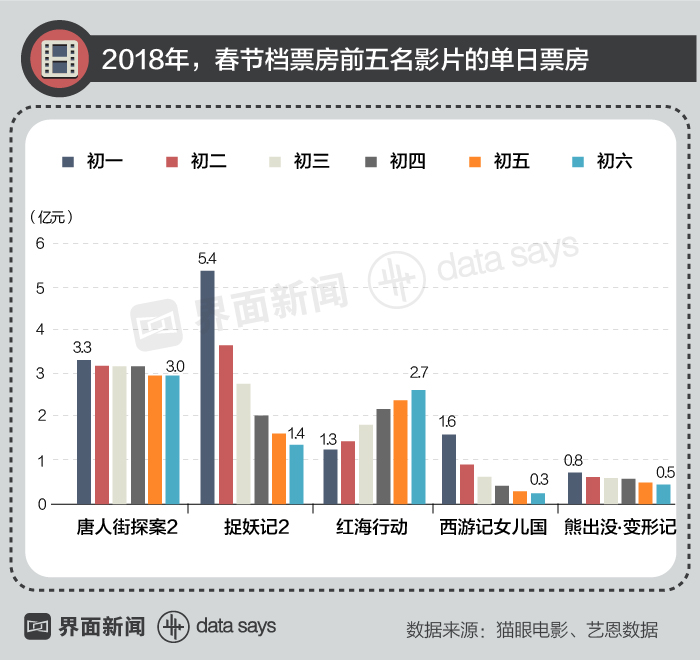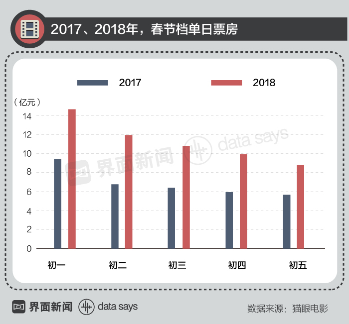 另据猫眼电影数据,2018年春节档的单日票房,相比2017年每日均出现大幅度上涨。且上映影片数量再度回升,为观众提供了更多可供选择的影片。