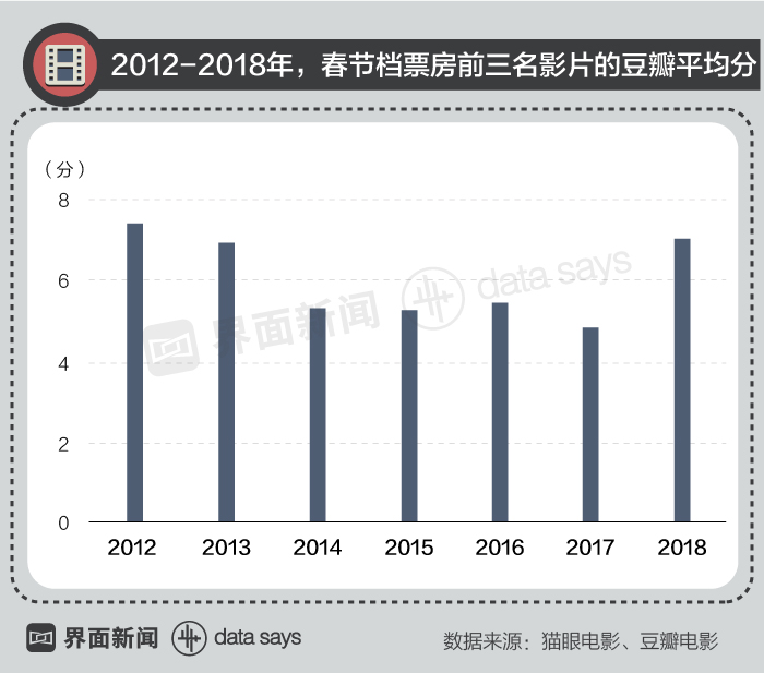 近年,春节档常因上映影片质量低、可供选择影片少被观众吐槽。2018年春节档在影片口碑方面也出现了反转,票房排行前三名影片的豆瓣平均分创5年来新高。