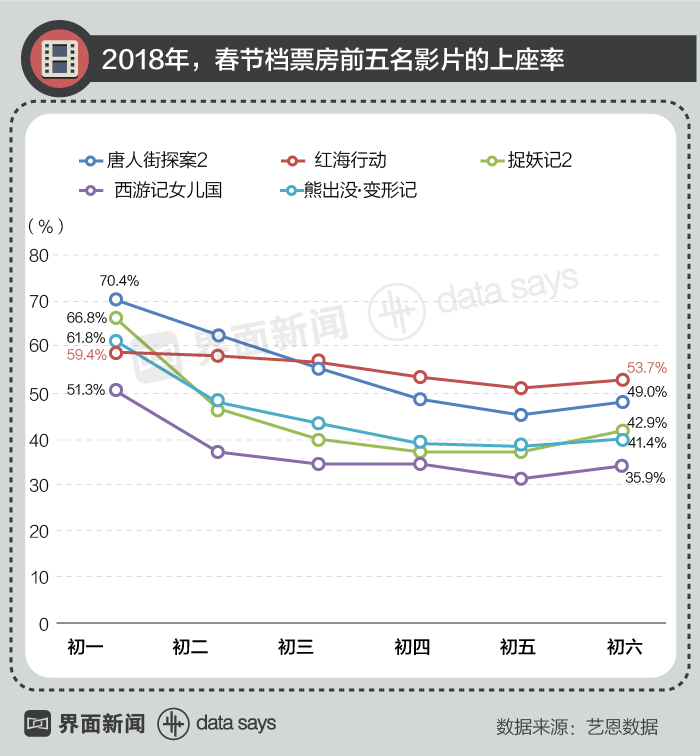 冯小刚导演曾经嘲讽,中国垃圾电影这么多和大批垃圾观众有很大关系。从今年春节档票房数据来看,票房排行前五名影片中豆瓣评分较低最低的《捉妖记2》和《西游记女儿国》,从大年初一开始票房直线下滑;相反《红海行动》凭借良好口碑,成了春节档期间唯一一部票房逐日攀升的影片,其院线排片率也随之增多。