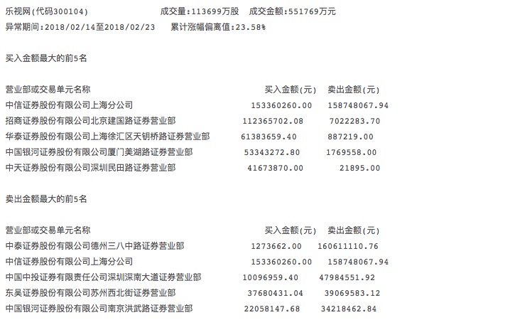 从2月23日盘后数据来看,近三个交易日内,中信证券上海分公司买入1.53亿元并卖出1.58亿元,两天一进一出净赚500万;招商证券北京建国路买入1.12亿元并卖出700万元,是23日乐视网最大的看多者;华泰证券上海徐汇区天钥桥路买入6138万元,卖出88.7万元,银河证券厦门美湖路营业部买入5334万元,卖出177万元,中天证券买入4167万元,卖出2.1万元,这三个席位也是仅次于招商证券北京建国路的看多者。
