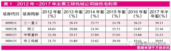 这种业务调整带来的是毛利结构的优化。三一混凝土机械毛利率由2012年35.69%下跌到2017年半年报的22.6%;而挖掘机械毛利率由27.11%上升到2017年半年报的37.0%。2017年半年报挖掘机械贡献毛利25.53亿元,高于混凝土机械的14.96亿元。三一重工最终捕捉到高毛利产品的机会,并在行业中奠定新的发展基础。(表1)