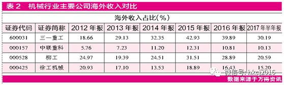 到2017年上半年,中国机械及运输设备同比增长14.3%,同期三一重工海外收入达到57.99亿元,海外收入占比为30.19%,高于柳工海外收入占比的20.59%、徐工机械海外收入占比的15.2%、中联重科海外收入占比的10.13%。回溯三一2012年以来的收入情况会发现,其海外收入占比从18.66%逐步发展到2016年的39.89%,4年间海外收入翻倍;2017年半年报三一重工海外收入增速25.9%,远超柳工海外收入增速的11.83%、中联重科海外收入增速的12.35%,低于徐工机械海外收入增速的34.11%。另外,据机构统计,2017年,三一重工挖掘机械出口超过3000台,占国内总出口销量9672台的30%以上,成为全年国内出口冠军。(见表2)