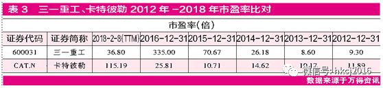 徐明向《红周刊》记者介绍说,“先看行业龙头卡特彼勒,目前市值918亿美元,2017年营业收入454.6亿美元,预测PE为28倍,PB为6.7倍。两者从体量上比较,卡特彼勒是三一的6倍。从市盈率角度来看,两者不相上下,而从市净率角度,三一似乎更加便宜。若从2007~2017年股价表现比较,期间卡特彼勒股价累计升幅190.4%,同期营业收入维持在450亿美元规模,利润反倒从2007年35.4亿下降至7.5亿;三一在此期间股价累计升幅为122.6%,营业收入从91.4亿至2017年三季度281.6亿扩大3倍,利润相仿。”(见表3)