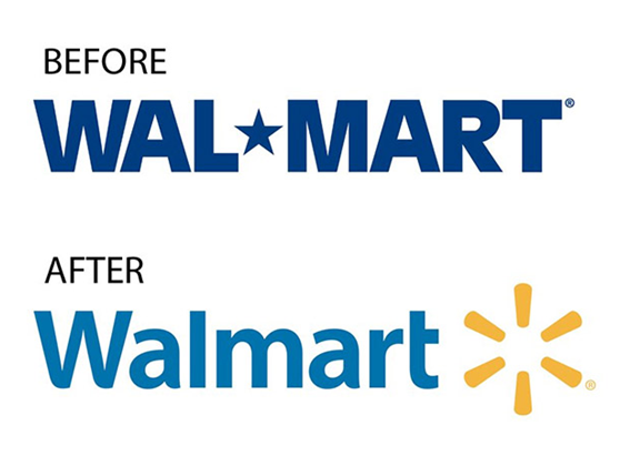 Mathews和她的团队认为原先的商标里全是深蓝色的大写字母,过于强调了“大企业”的感觉,正如一些批评家对沃尔玛的评论:沃尔玛如一个恶毒的巨人压垮了其他小企业。他们认为中间那颗充当连词符的星星是可忽略的,且后面的“MART”让人联想起街边卖便宜货的小店。