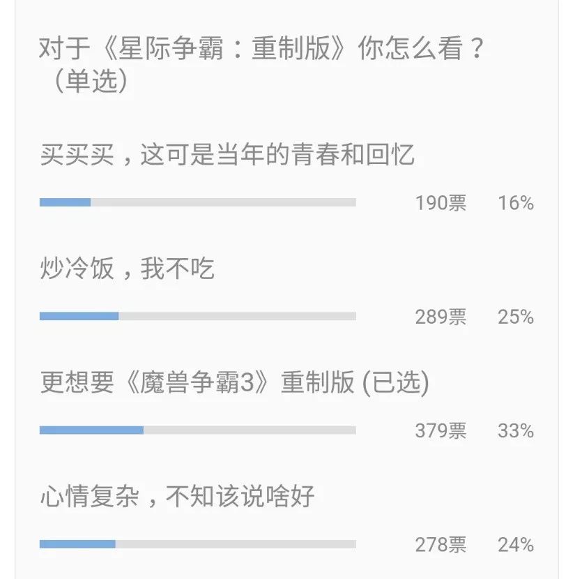 支持星际1重制的投票人数是最少的,而想要重制《魔兽争霸3》的投票人数是最多的
