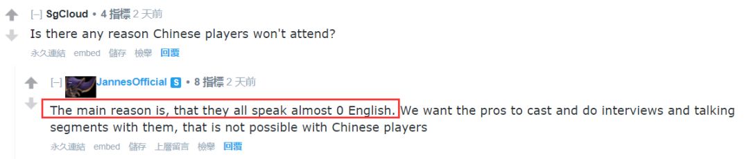 但在国外Reddit论坛的相关板块下,在被问起为何中国选手没被邀请时。一位解说(同时也是本次比赛的OB之一)表示,主要的原因是中国选手的英语水平太差了,无法满足比赛之外的采访等需求。