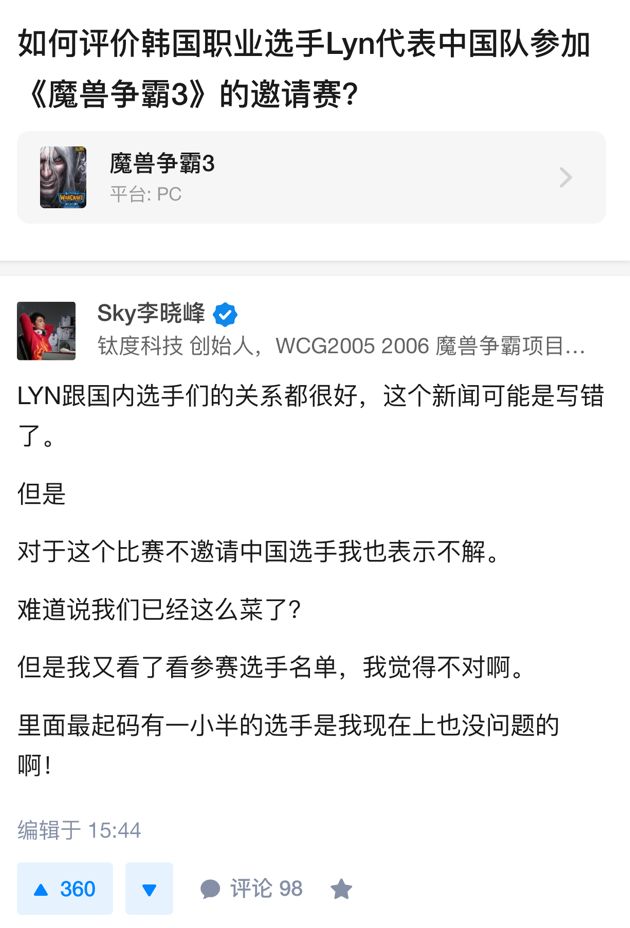 在知乎的一个“相关问题下,国内最知名的前War3选手Sky李晓峰忿忿地表示了不解,并认为以当前参赛选手的名单水平,退役已久的他现在上去参赛也没问题。